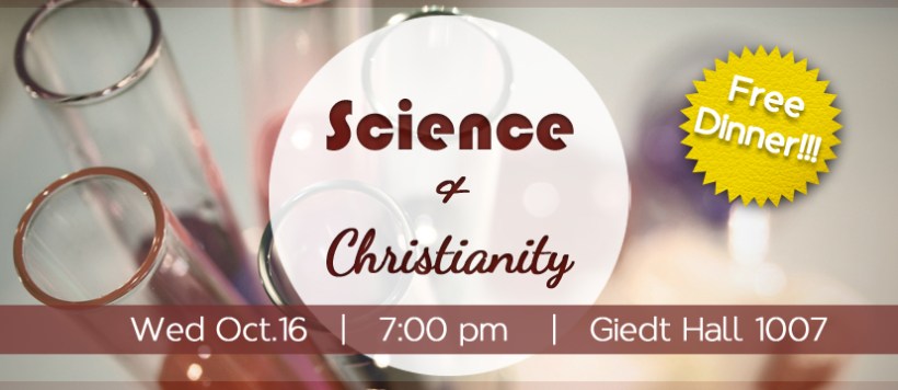 This Wednesday we will be having a special talk on the topic of Science & Christianity. Are science and faith compatible? What about evolution and the Big Bang? Come hear a special talk on Science & Christianity and we tackle these important questions in our search to reconcile issues of faith, reason, science and God. We will begin at 7pm with a free dinner, and our location is 1007 Giedt Hall by the Engineering buildings.