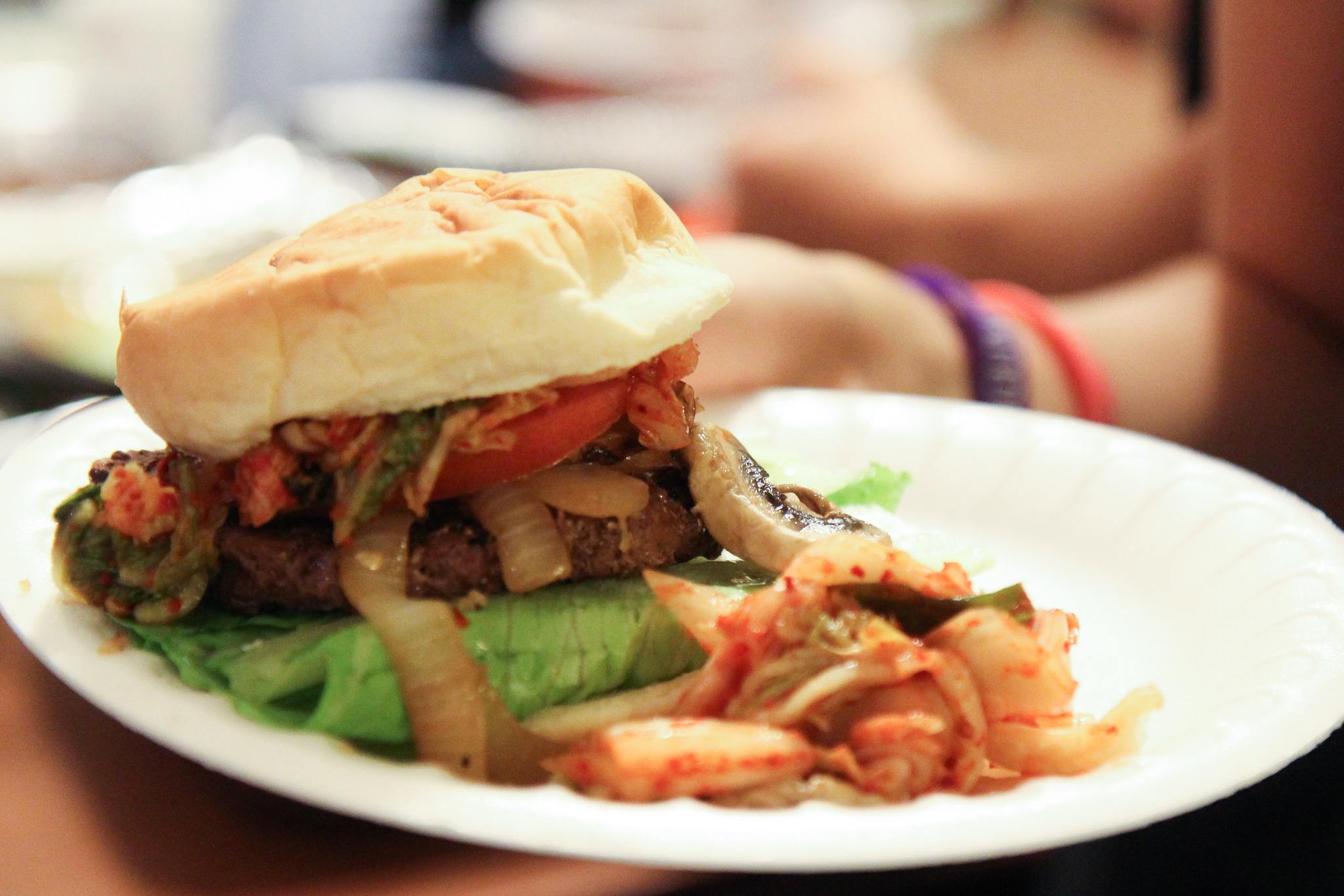 This is not the traditional BBQ burgers and hotdogs, with grilled onions, tomatoes, ketchup, mustard, etc.  Add some potato salad and chips on the side.  We had a fun evening of BBQ Burgers and Hotdogs, Asian style!  What is that on the burger?  KimChi?  Not just Kimchi, Sriracha, and others…